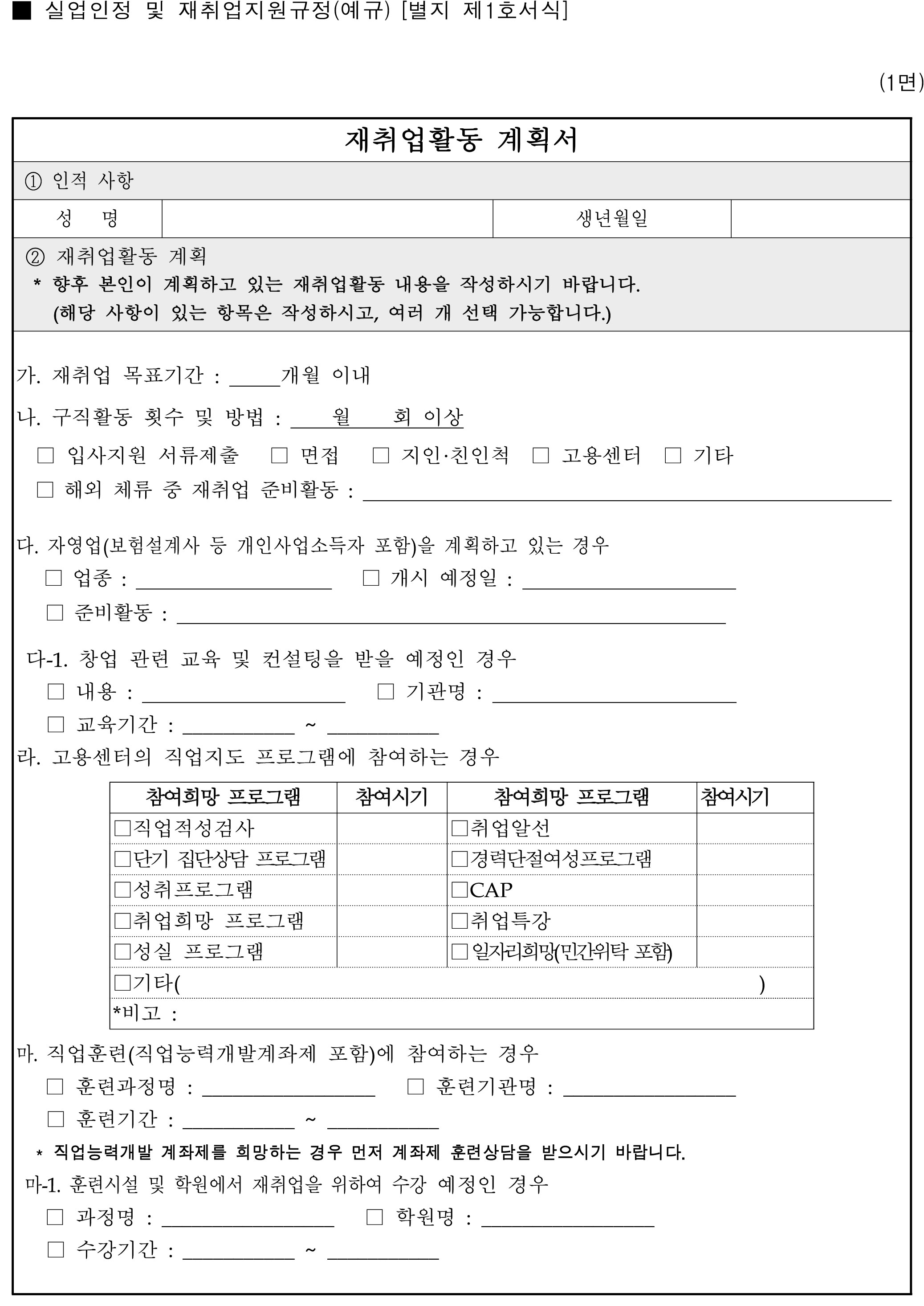 실업급여를 받고 계시다면 필요한 재취업활동 계획서 양식입니다.