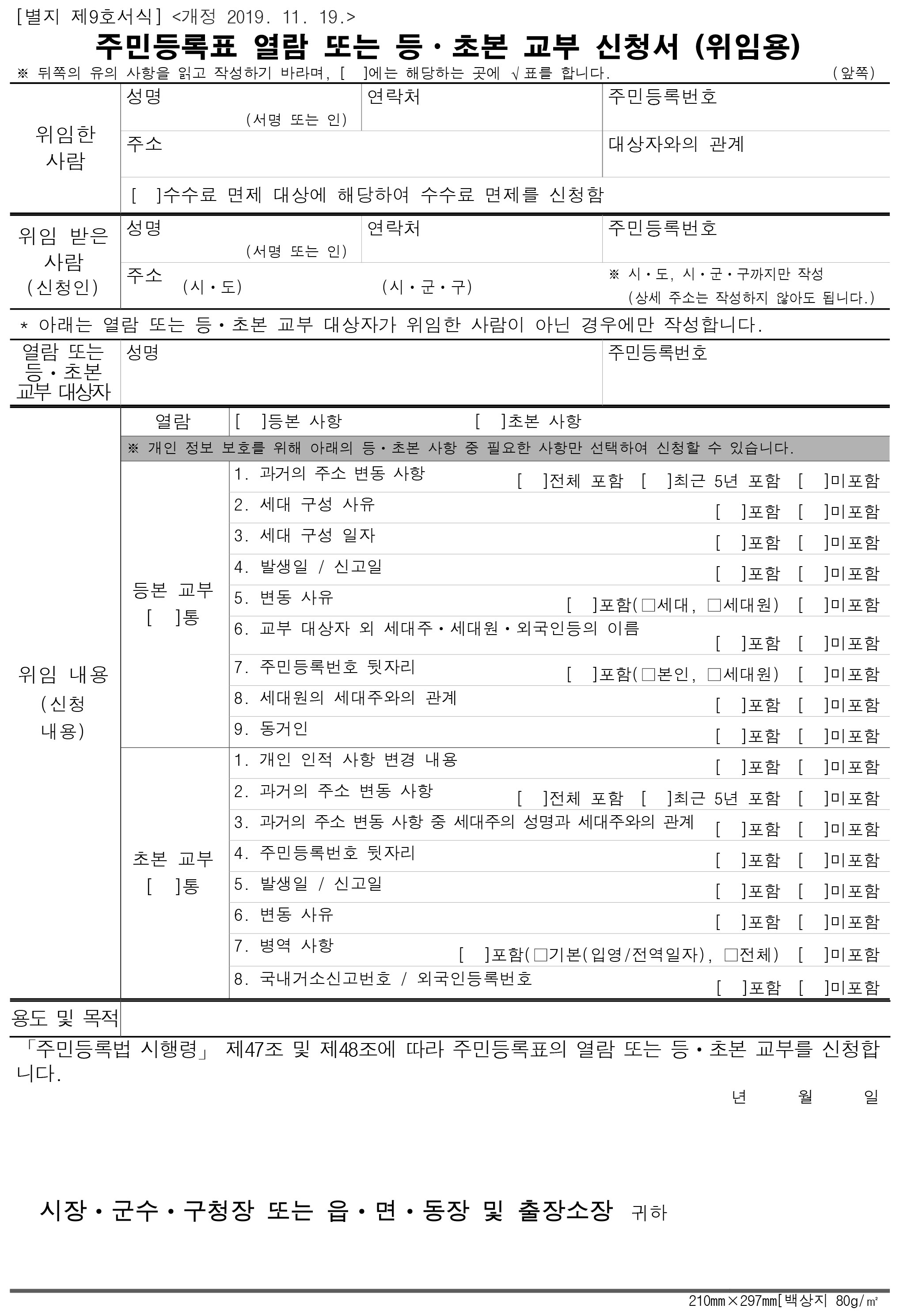 주민등록 등본, 초본 대리 발급, 위임용 양식