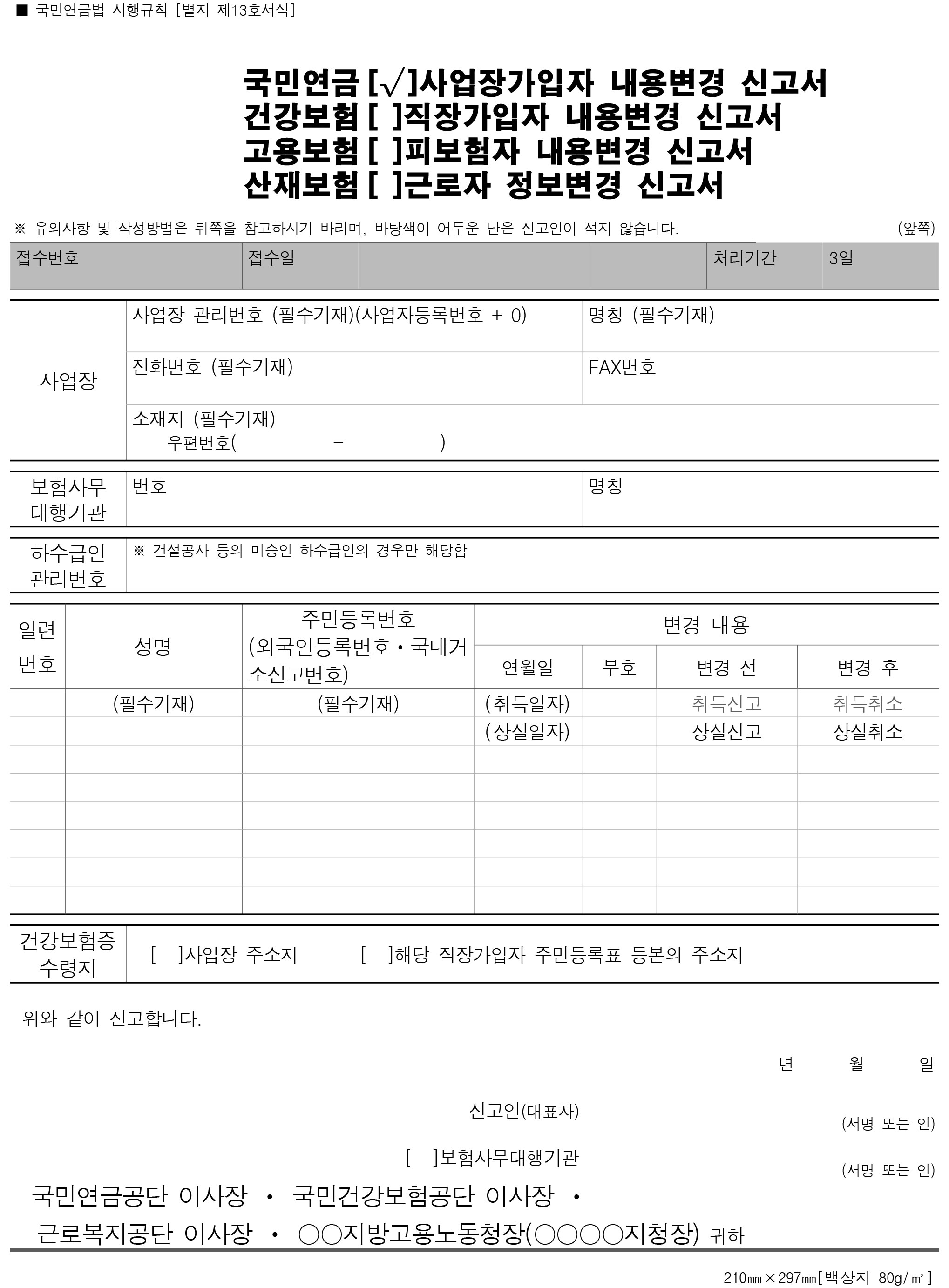 4대보험 국민연금 사업장 가입자 취소, 변경 신고서 양식
