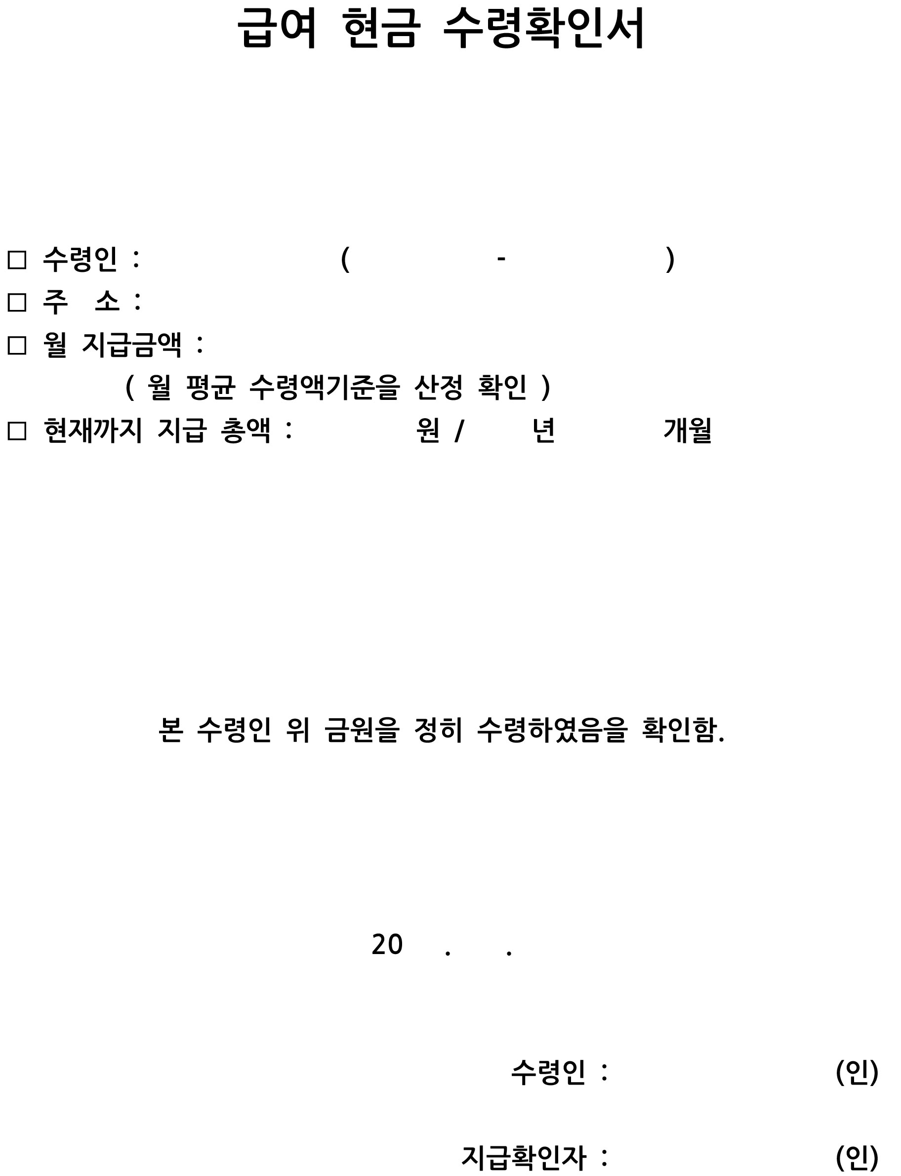 급여 현금 수령확인서 양식입니다.