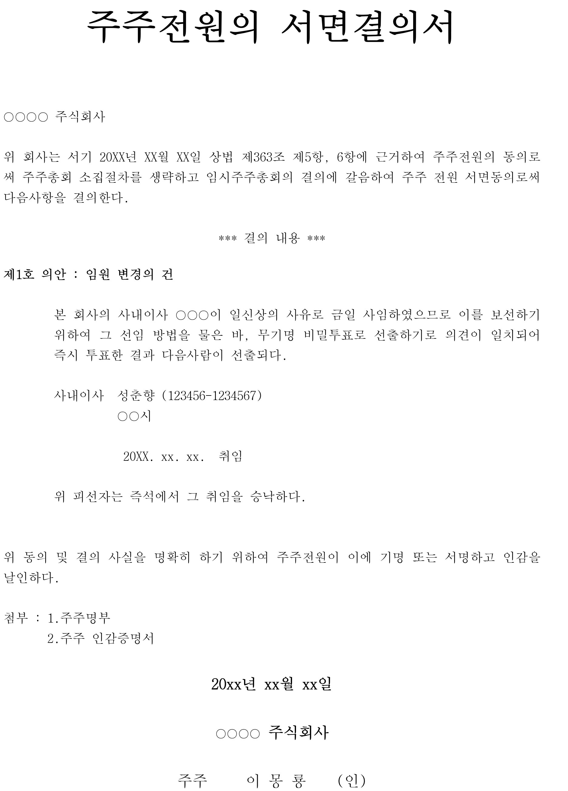 법인 이사 감사등 임원 변경에 필요한 주주 전원 서면결의서 양식입니다.