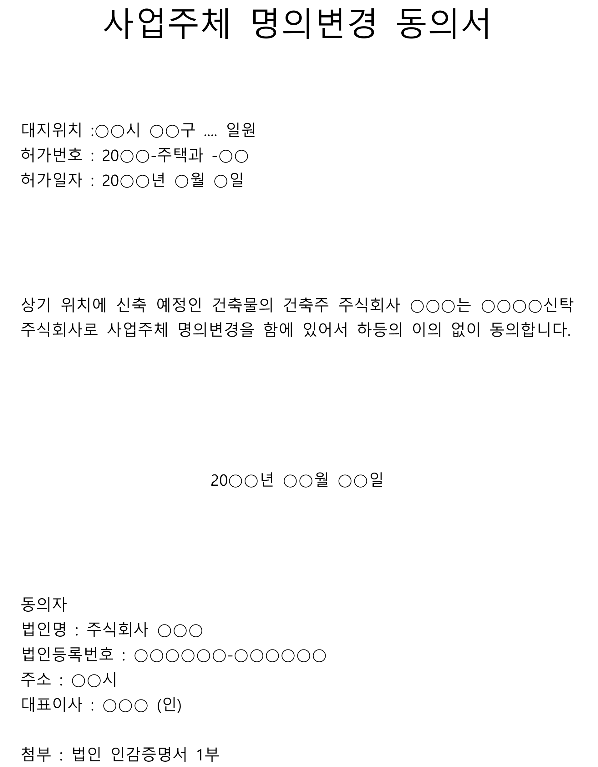 사업주체 명의변경 동의서를 한글 파일로 첨부해드립니다.