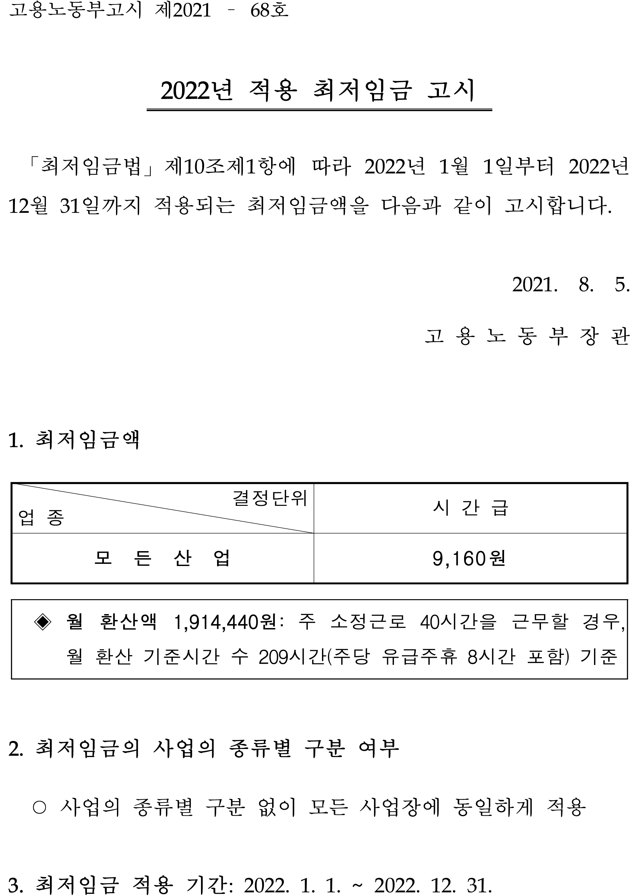 2022년 최저임금이 고시되었습니다.
