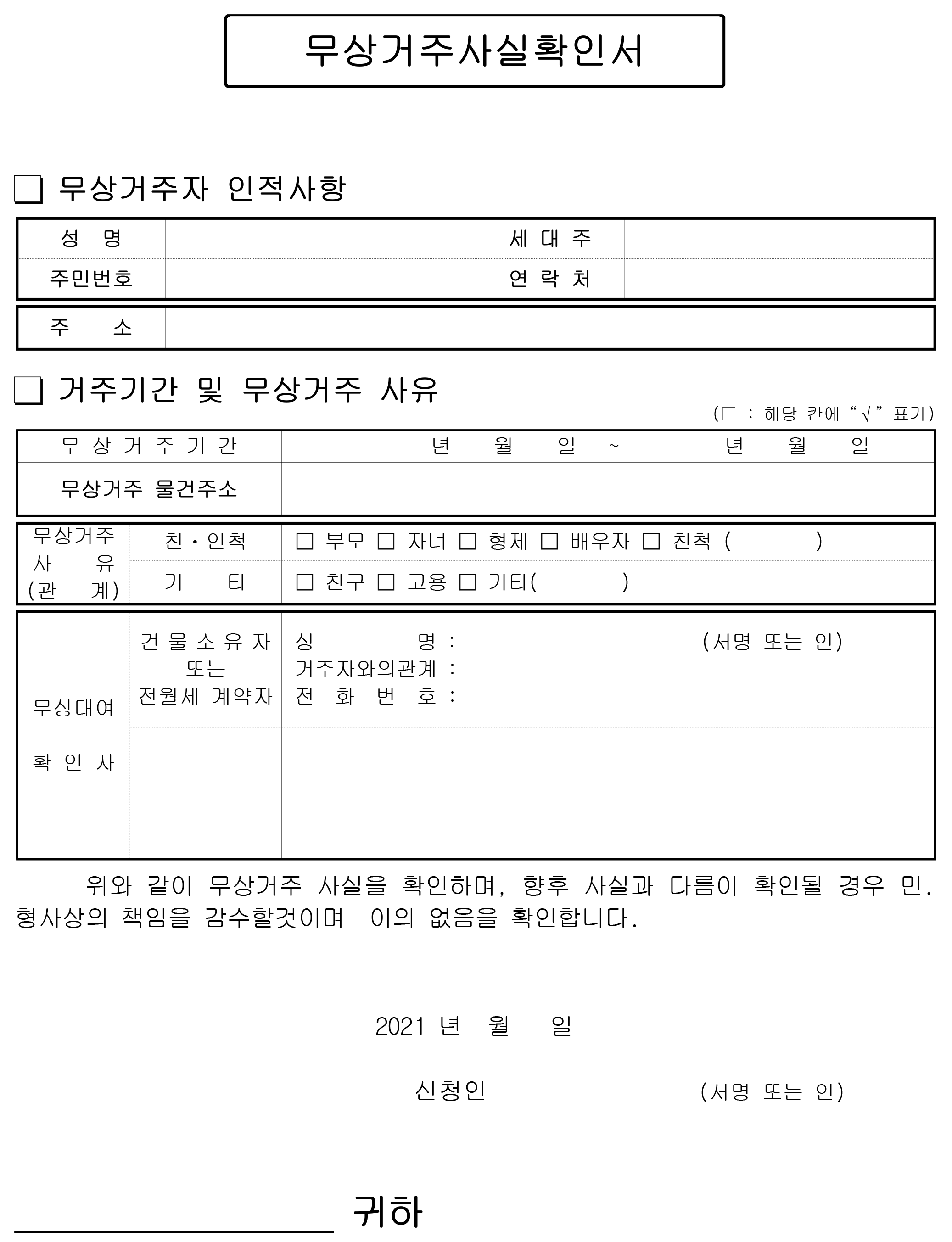 무상거주사실 확인서 한글 양식입니다.