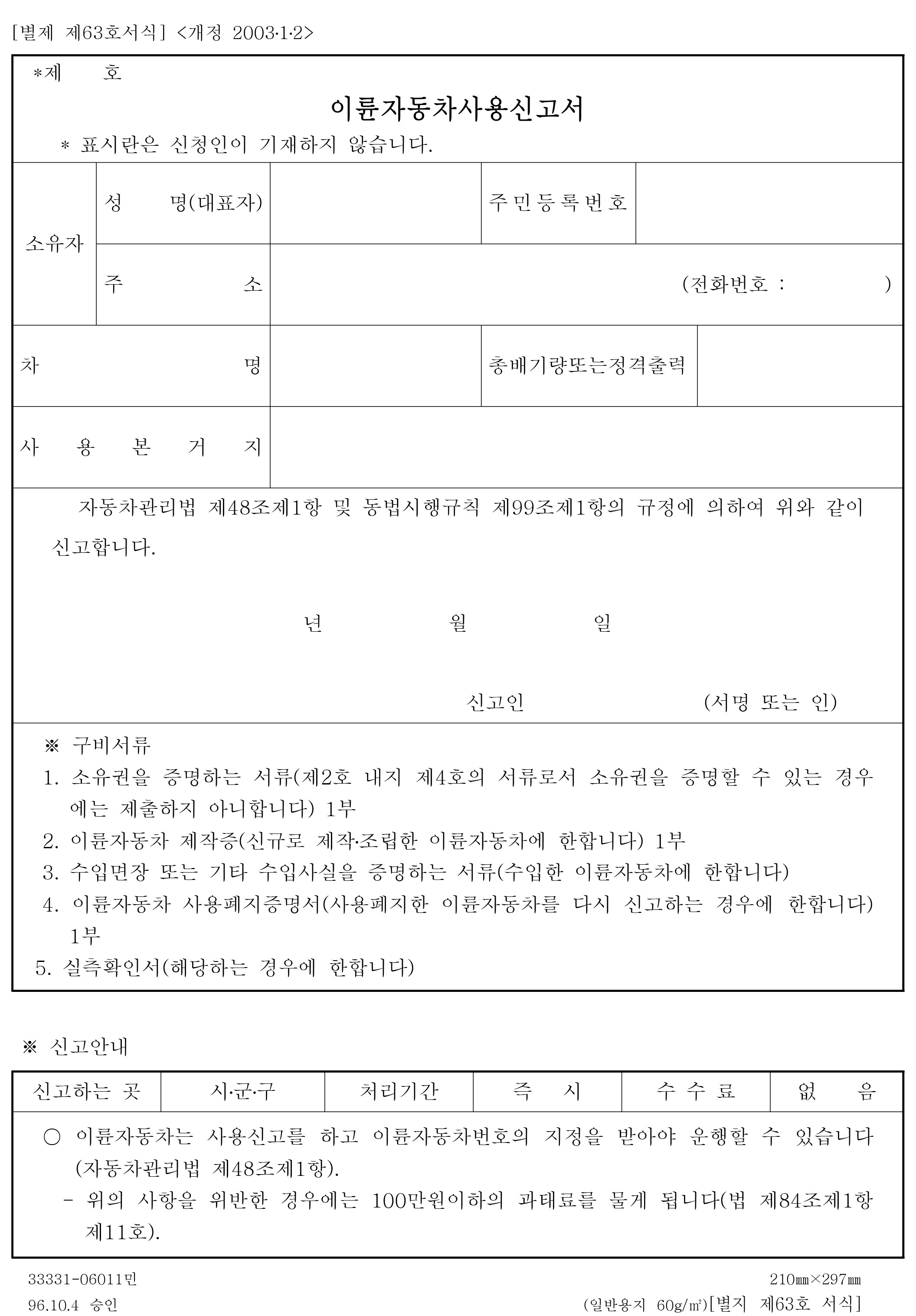 이륜차 사용신고서 입니다.