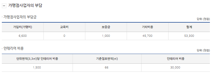 보증금을 제외한 가맹비와 집기에 5330만원을 투자하여 평균 창업을 하고 계시는 것을 알수 있습니다.