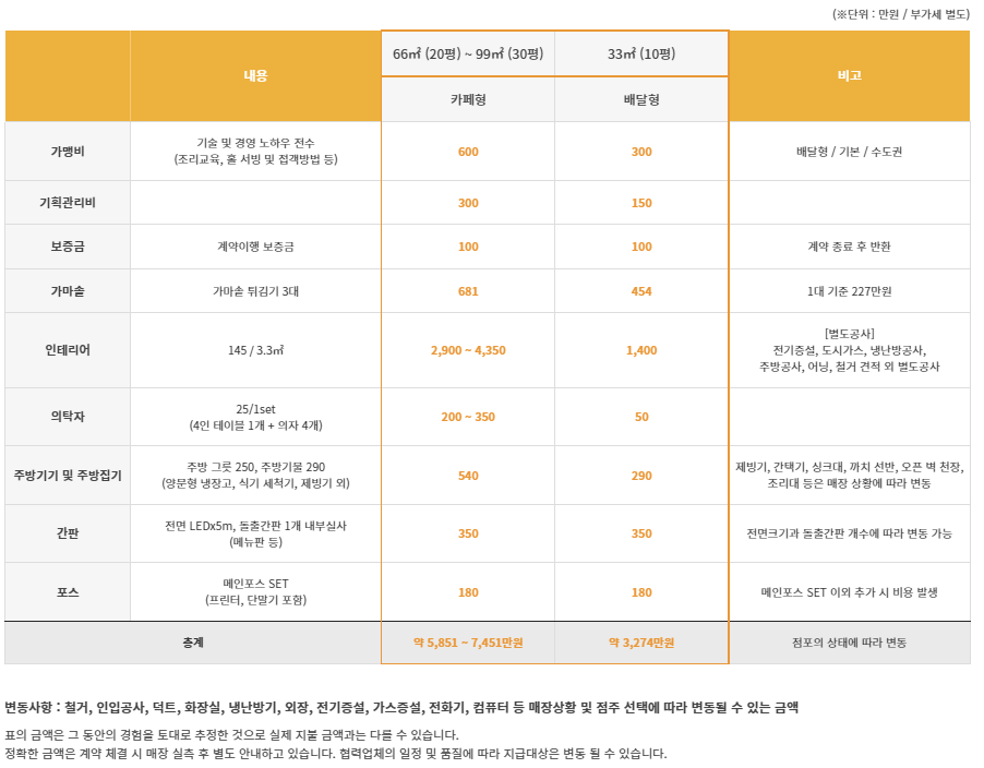 평균 매장이 20평기준으로 오픈을 하게 되며 인테리어 비용은 3천만원이 듭니다.