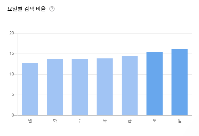 월요일이 가장 검색량이 적으며 주말로 갈수록 검색량이 늘어나고 있습니다.