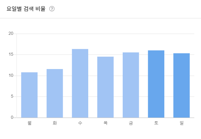 수요일이 검색 비율이 가장 높으며 월요일 화요일이 낮은 편입니다.