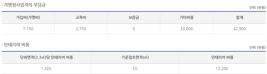 10평 기준 창업 비용입니다. 가맹비는 500만원, 보증금, 로열티는 없습니다.