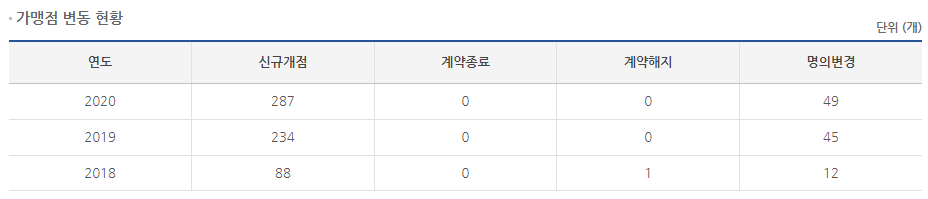 2020년에도 287개가 오픈을 하며 코로나 시기에도 성공적으로 매장 확보를 하였습니다