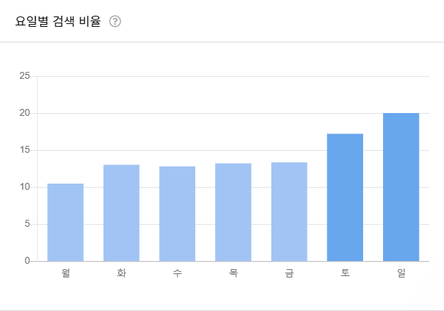 주말이 검색 비율이 높으며 일요일이 월등합니다