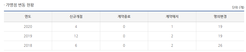 2020년 기준 신규개점은 4개 밖에 되지 않습니다.