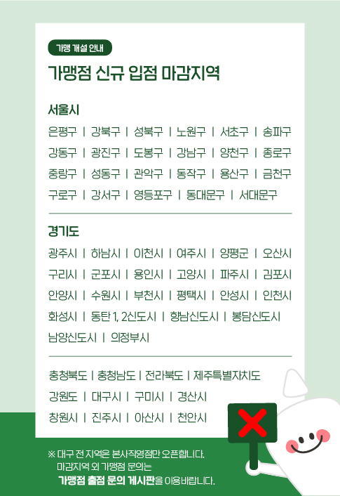 위 이미지는 신전떡볶이 홈페이지에서 가져온 것으로 해당 지역과 대구는 창업이 불가능 합니다.
