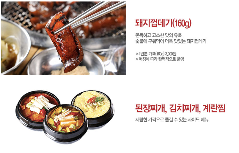 돼지껍데기와 된장찌개, 김치찌개, 계란찜을 추가 금액을 내면 먹을수 있습니다.