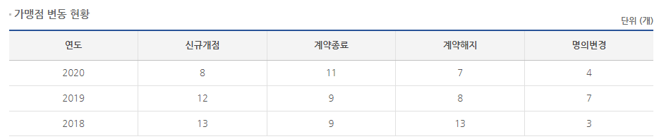 신규개점은 매년 10개소 정도이며 계약종료 해지가 더 많습니다.