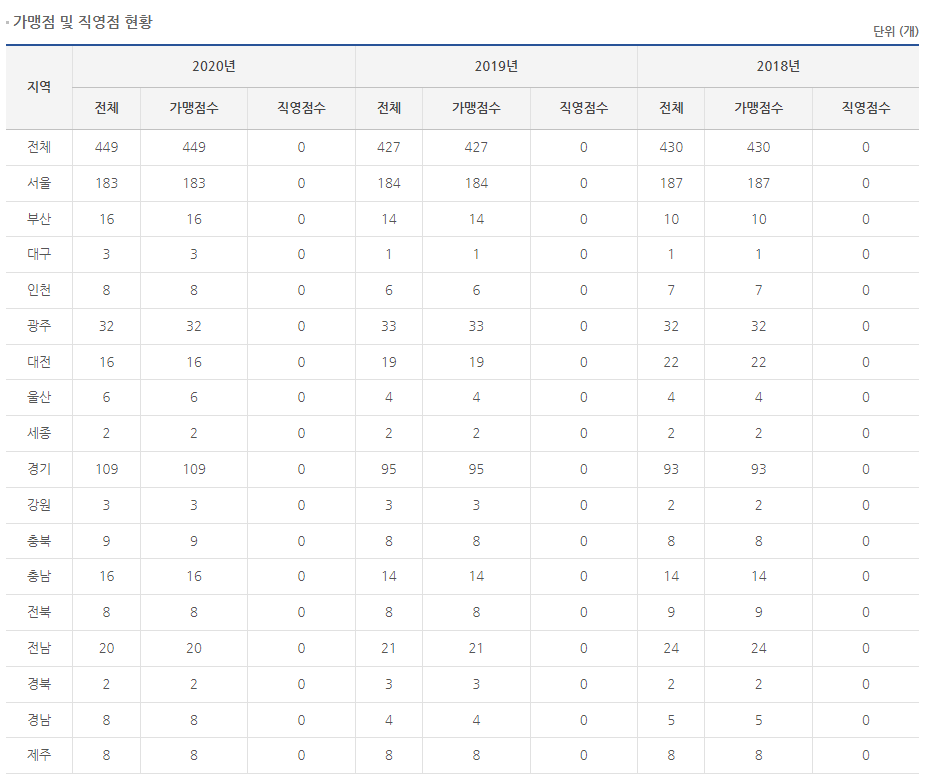 2020년 기준 449개의 매장이 있으며 전부 가맹점입니다.