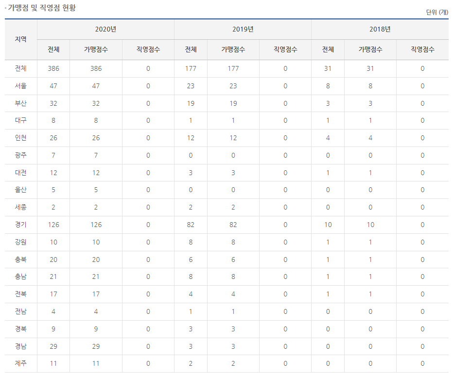 2020년 기준 386개의 매장이 있으며 전부 가맹점입니다.