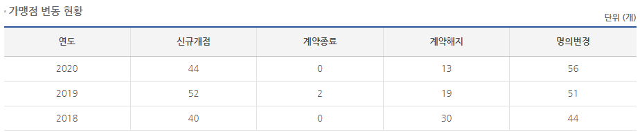 2020년 신규개점이 44개 점포이며 계약해지는 매년 줄어들고 있습니다.