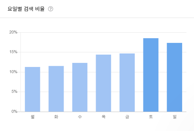 주말에 검색 비율이 가장 높으며 그중에 토요일이 검색량이 가장 많습니다.