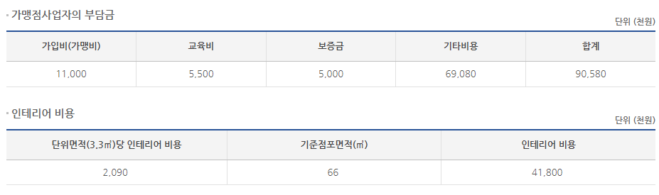 가맹비는 1100만원입니다. 교육비 550만원이 있습니다.