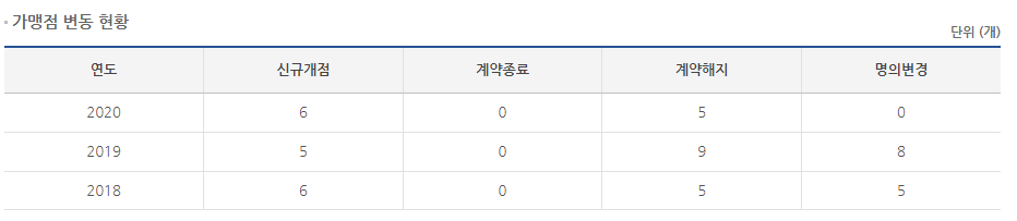 전녀대비 직영점이 하나 줄고 가맹점이 하나 늘었습니다.