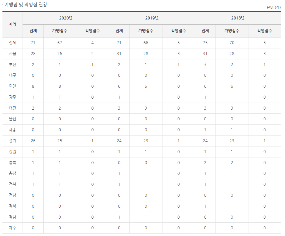 전체 71개의 매장중 가맹점은 67개 직영점은 4개 운영하고 있습니다.