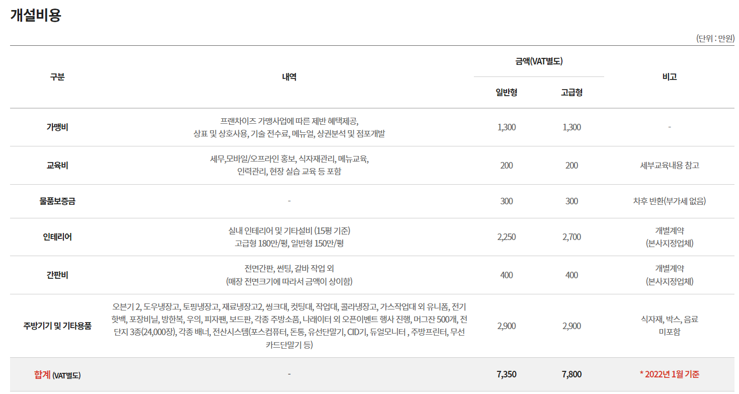 가맹비 1430만원입니다, 교육비 220만원, 보증금 300만원이 있습니다.