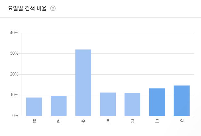 요일별 검색 비율이 수요일이 가장 높은데 아마도 수요일 방문 포장 40% 할인이 원인일듯합니다.