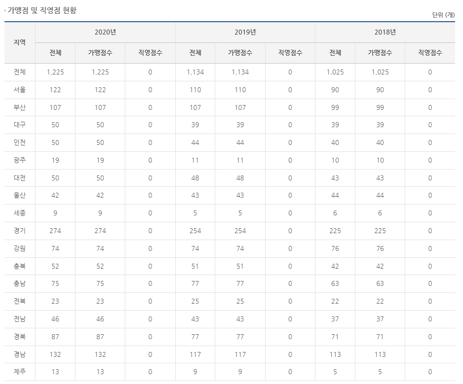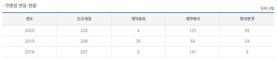 2020년 기준 신규개점 220개, 계약종료 4개, 계약해지 125개, 명의변경 69개입니다.