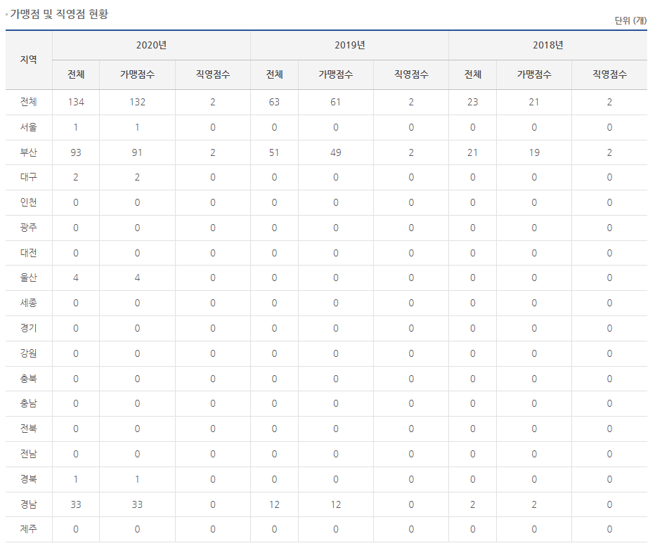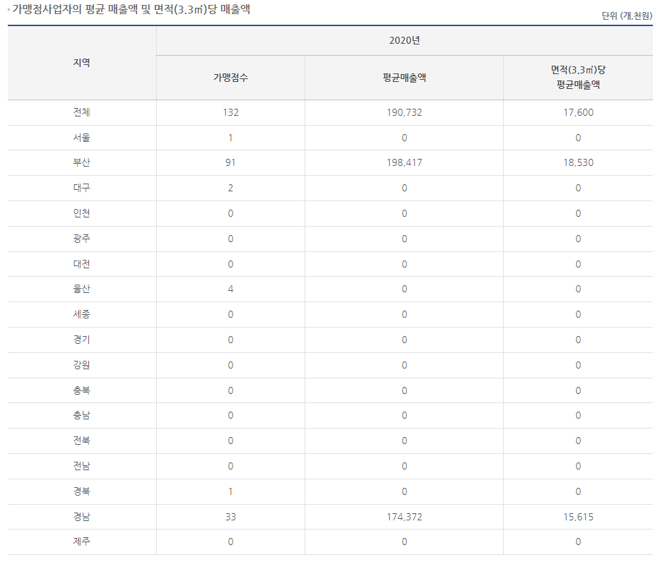 대부분 가맹점의 지역이 부산 경남이라 타 지역별 매출을 비교할수는 없습니다.