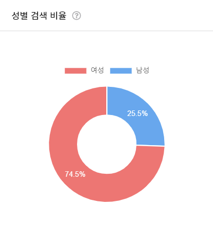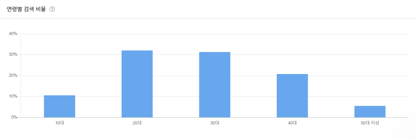 20대 30대가 각각 30%가 넘는 검색 비율을 차지하고 있으며 40대가 20%를 넘기고 있습니다.