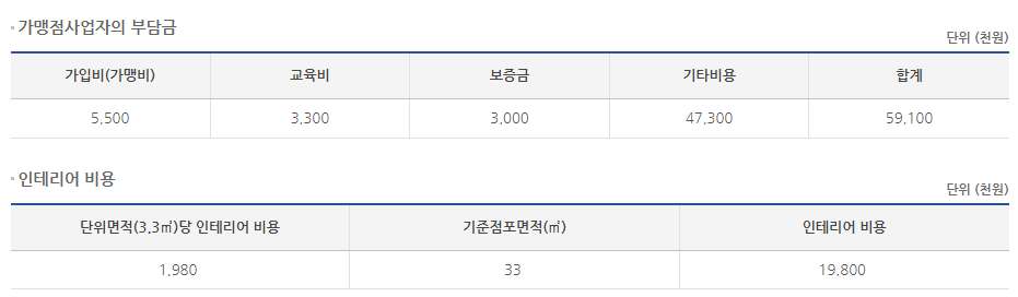가맹비 550만원, 교육비 330만원, 보증금 300만원입니다. 집기 기기등 비용은 4730만원입니다.