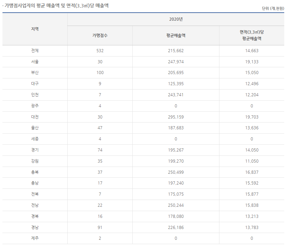 프랜차이즈의 평균매출등을 알아보겠습니다.