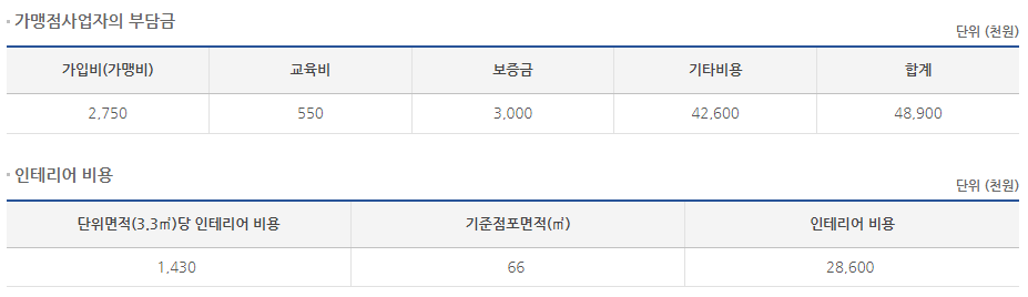 홈페이지에 창업 관련된 비용은 나와있지 않아 공정위 정보공개서를 통해 알아보겠습니다.