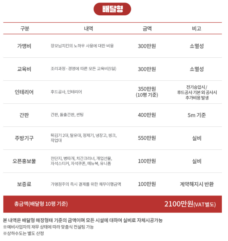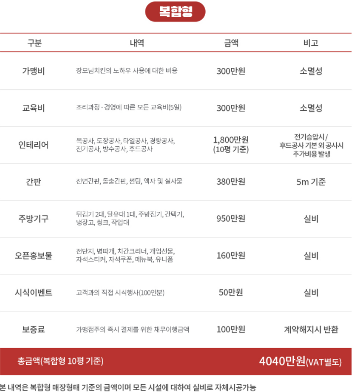 가맹비 300만원 교육비 300만원있습니다.인테리어 10평기준 350만원입니다. 간판이 400만원이구요주방기구가 550만원입니다.보증금 100만원가 오픈 홍보물 100만원 있습니다.모든 시설에 자체시공 가능합니다.