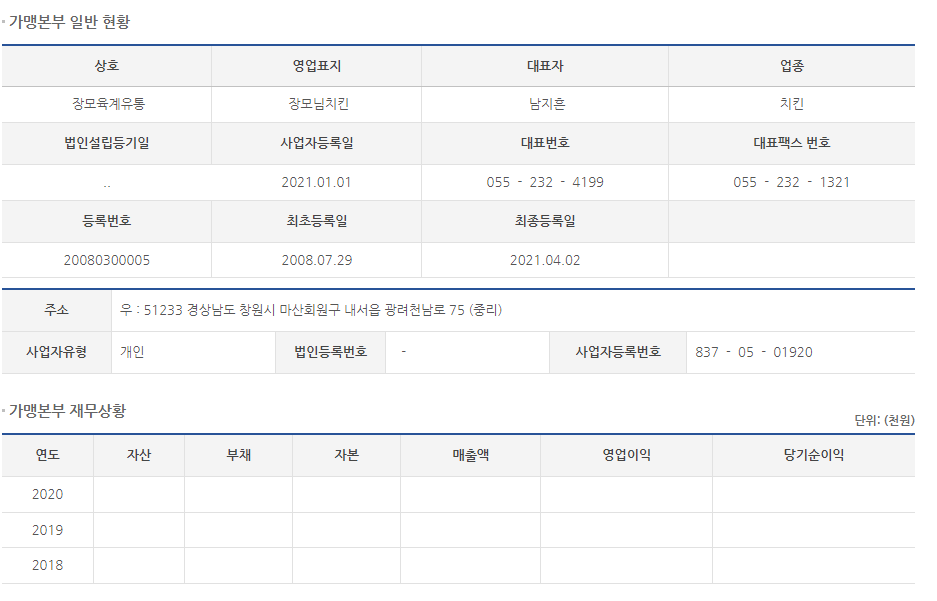 장모님치킨의 평균매출등을 알아보겠습니다.