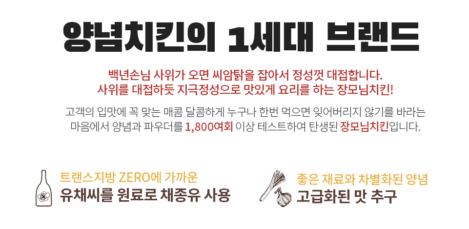 양념치킨 1세대 브랜드 장모님치킨, 오랜 전통치킨의 차별화된 맛을 보여드리겠습니다.