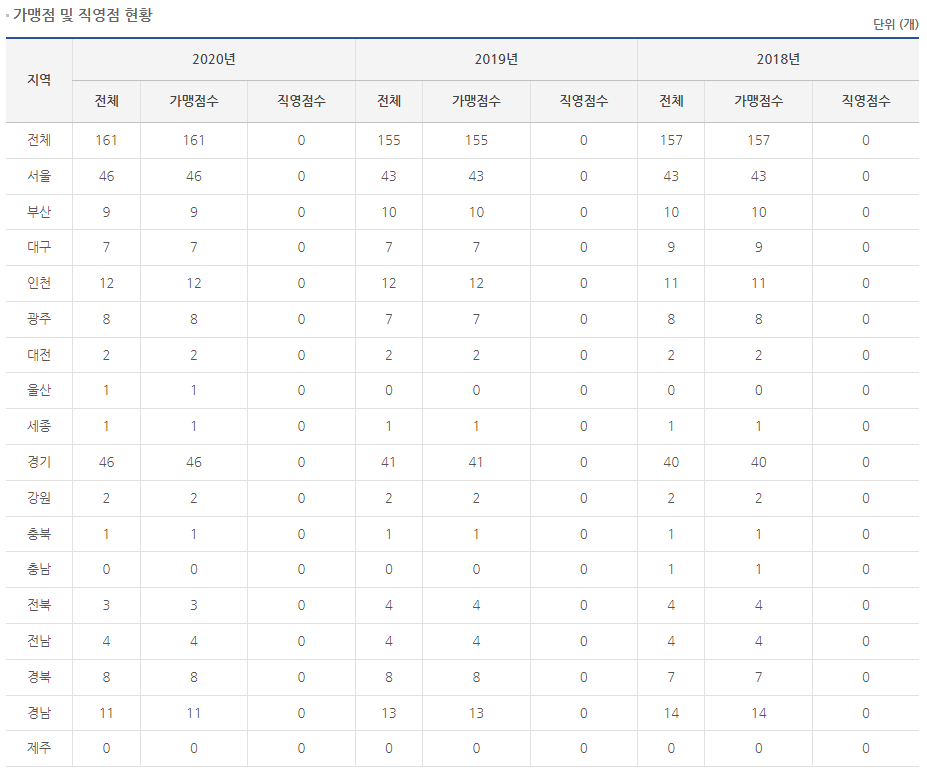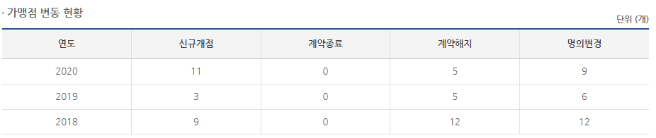 2020년 신규개점 11개이며 계약해지가 5건있어서 조금 가맹점이 늘어났습니다.