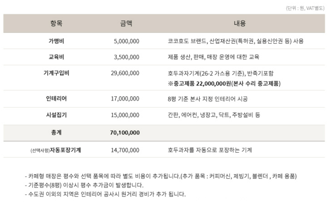 총 7010만원이 들어가게 되며, 자동포장기계는 선택사양이지만 1470만원입니다.