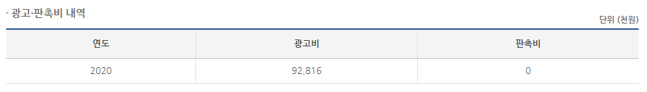 2020년 광고비로 9281만원을 지출했으며, 판촉비는 지출하지 않았습니다.