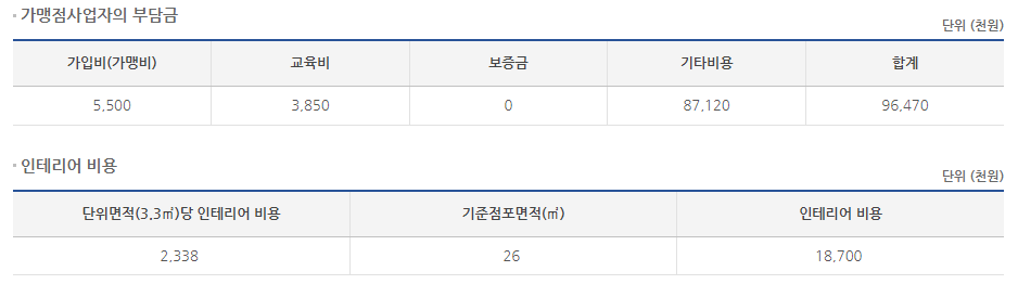 가맹비는 550만원입니다. 교육비가 385만원이네요.
