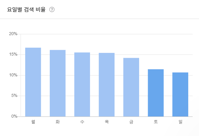 월요일이 검색량이 제일 많으며 주말로 갈수록 검색량이 낮아지고 있습니다.