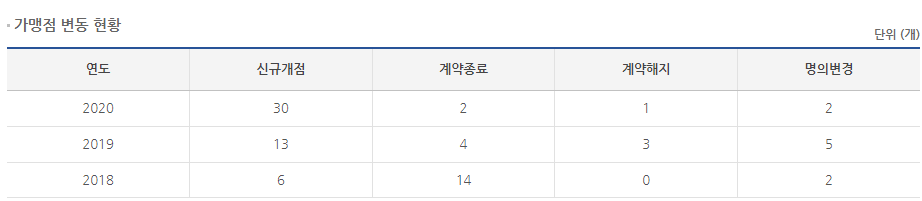 30개가 개점을 하였으며 개약종료는 2개, 계약해지는 1개입니다.