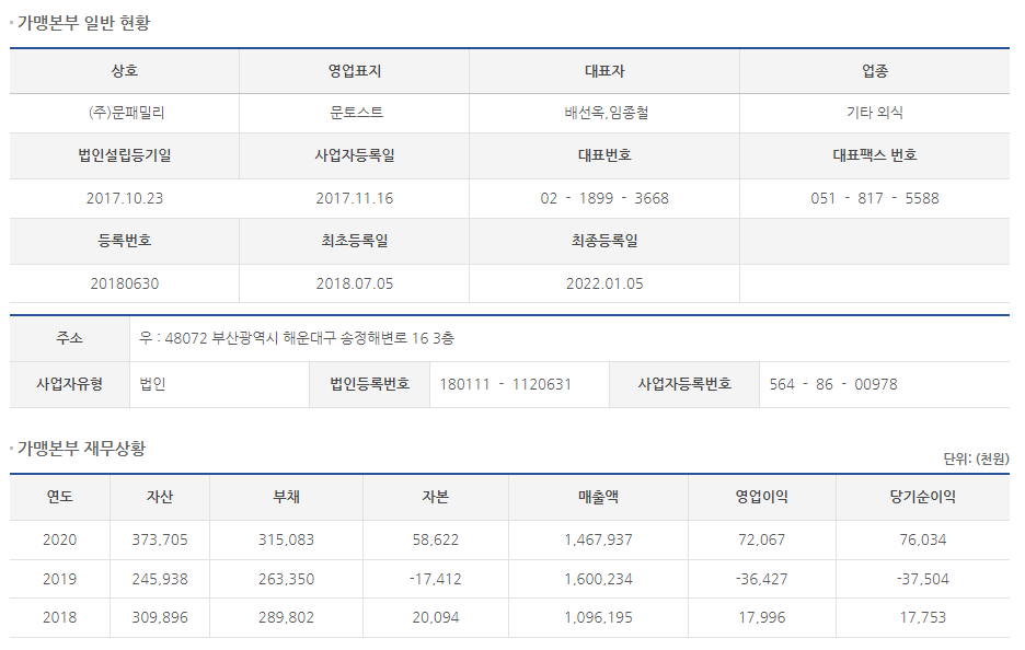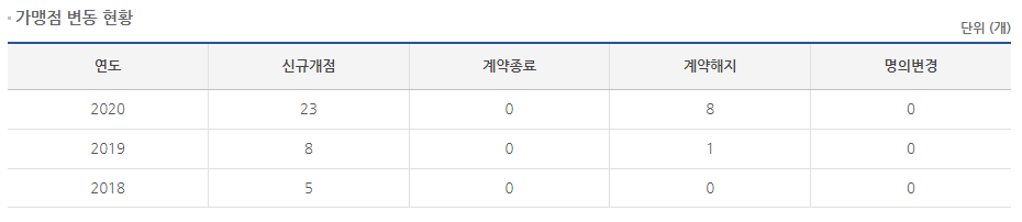 공정위 정보공개서를 통해 알아봤습니다.