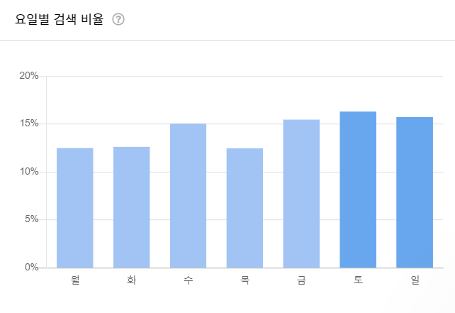 금토일 주말에도 검색량이 많으며, 가장 많은 날은 토요일입니다.