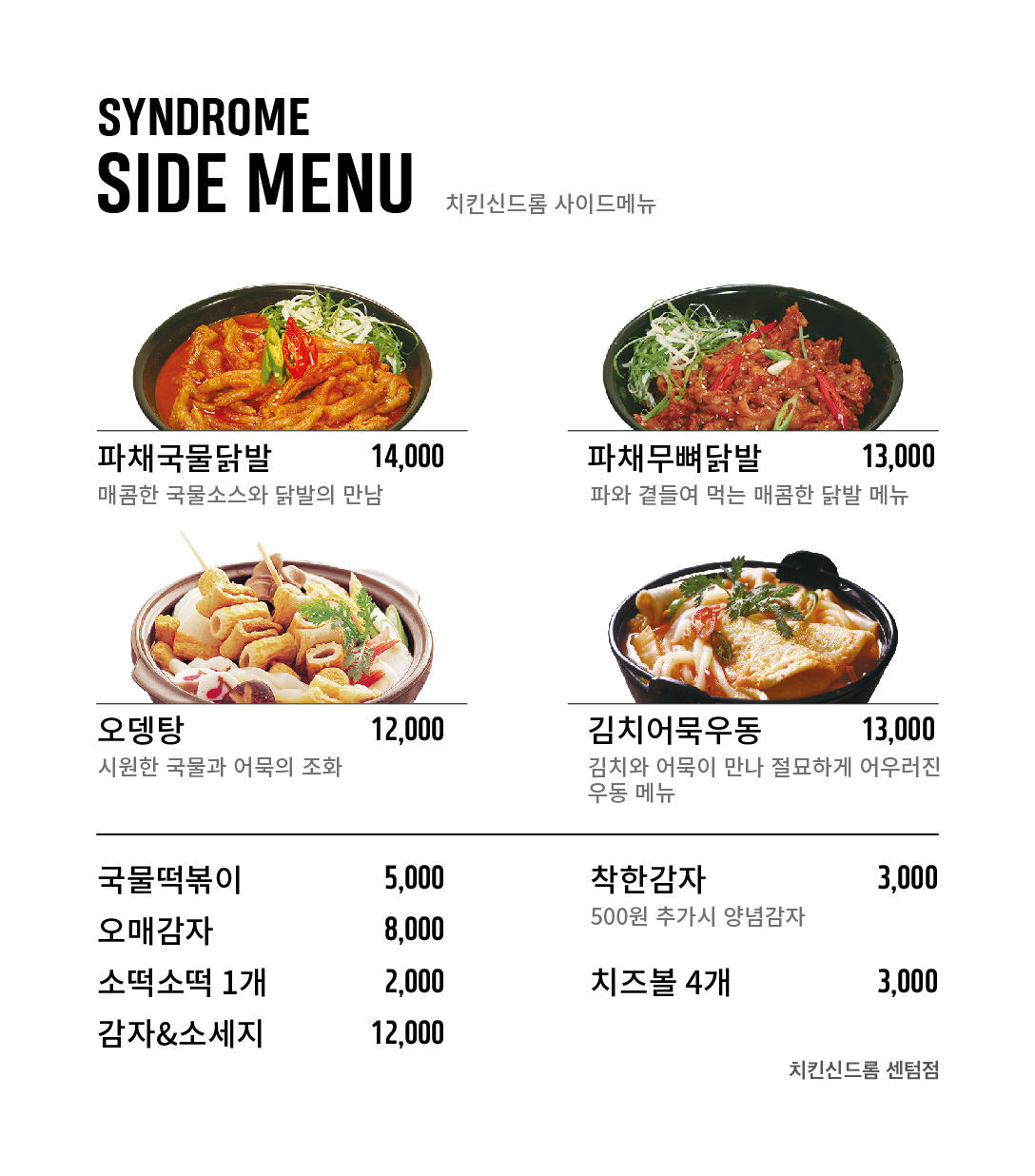국물닭발 어묵우동, 소떡소떡등의 사이드 메뉴가 있습니다.