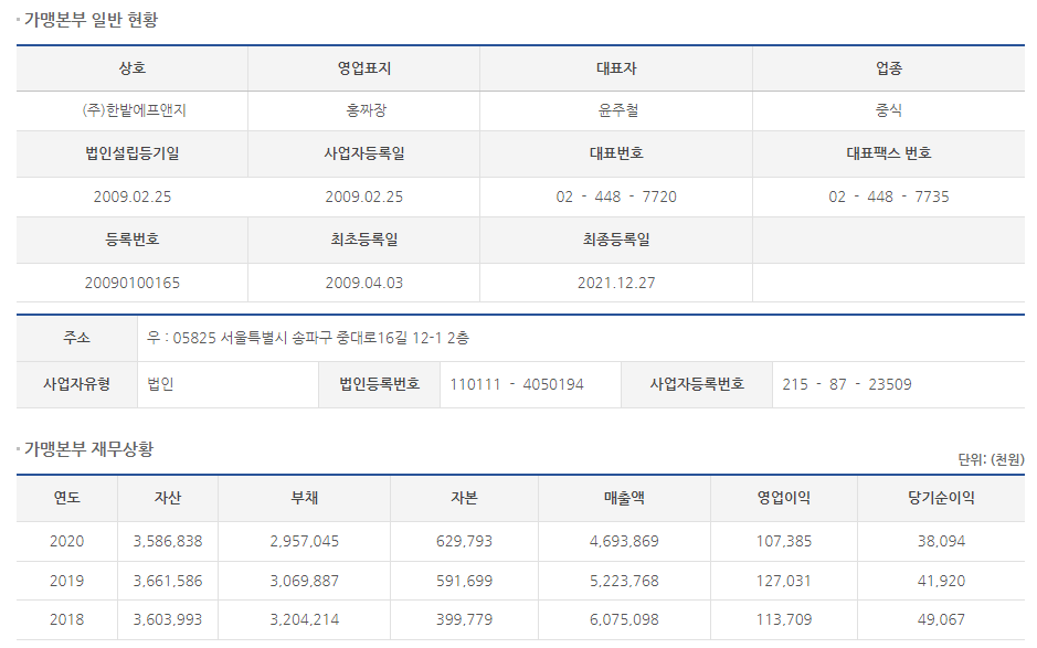 추가 매출등, 가맹점 수 등은 공정위 정보공개서를 통해 알아보겠습니다.