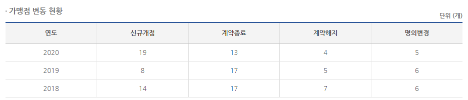 2020년 기준 신규개점이 19개, 계약종료 13개, 계약해지 4개입니다.