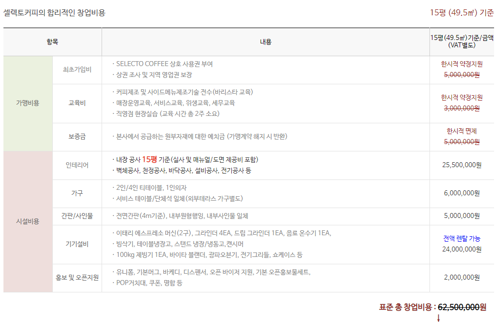 현시점 15평 기준 창업 비용은 6250만원이나,